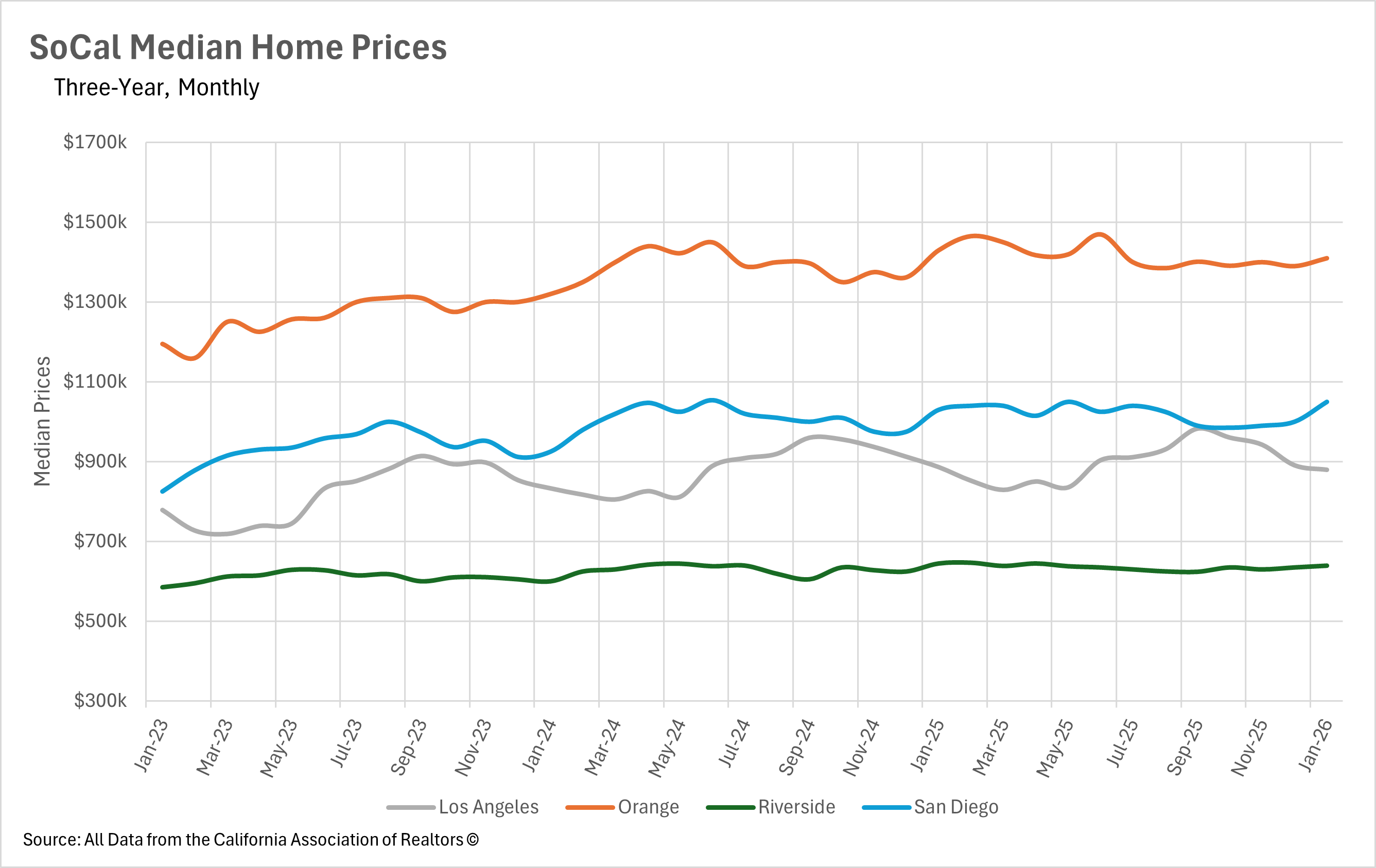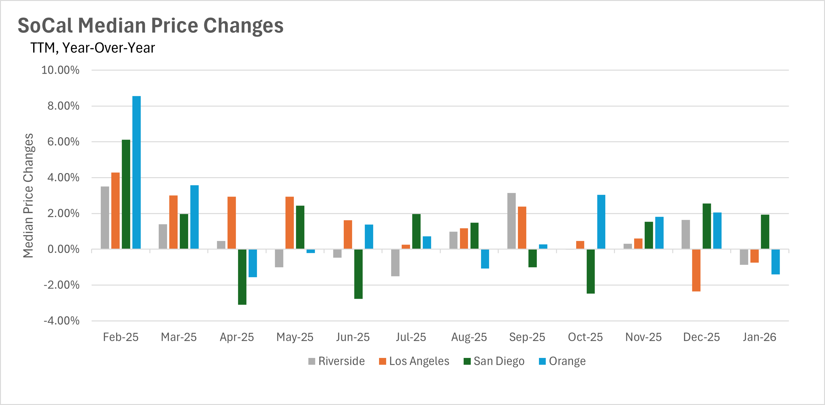 Southern California's housing markets are showing mixed results on the pricing front as we kick off 2026. San Diego continues to be the bright spot, with the median single-family home selling for $1,050,000 in January, representing a solid 1.94% year-over-year increase. This marks the third consecutive month of year-over-year gains for San Diego after a bumpy middle portion of 2025. However, the other three markets in the region are telling a different story. Los Angeles posted its second consecutive month of year-over-year declines, with the median sale price coming in at $879,720, down 0.75% from last year. Orange County also dipped into negative territory after four consecutive months of gains, with the median single-family home selling for $1,410,000, a 1.40% year-over-year decline. Riverside rounded out the mixed picture with a modest 0.86% year-over-year decline, bringing its median sale price to $639,440. It will be interesting to see whether San Diego's momentum spreads to the rest of the region as we move into the spring selling season.