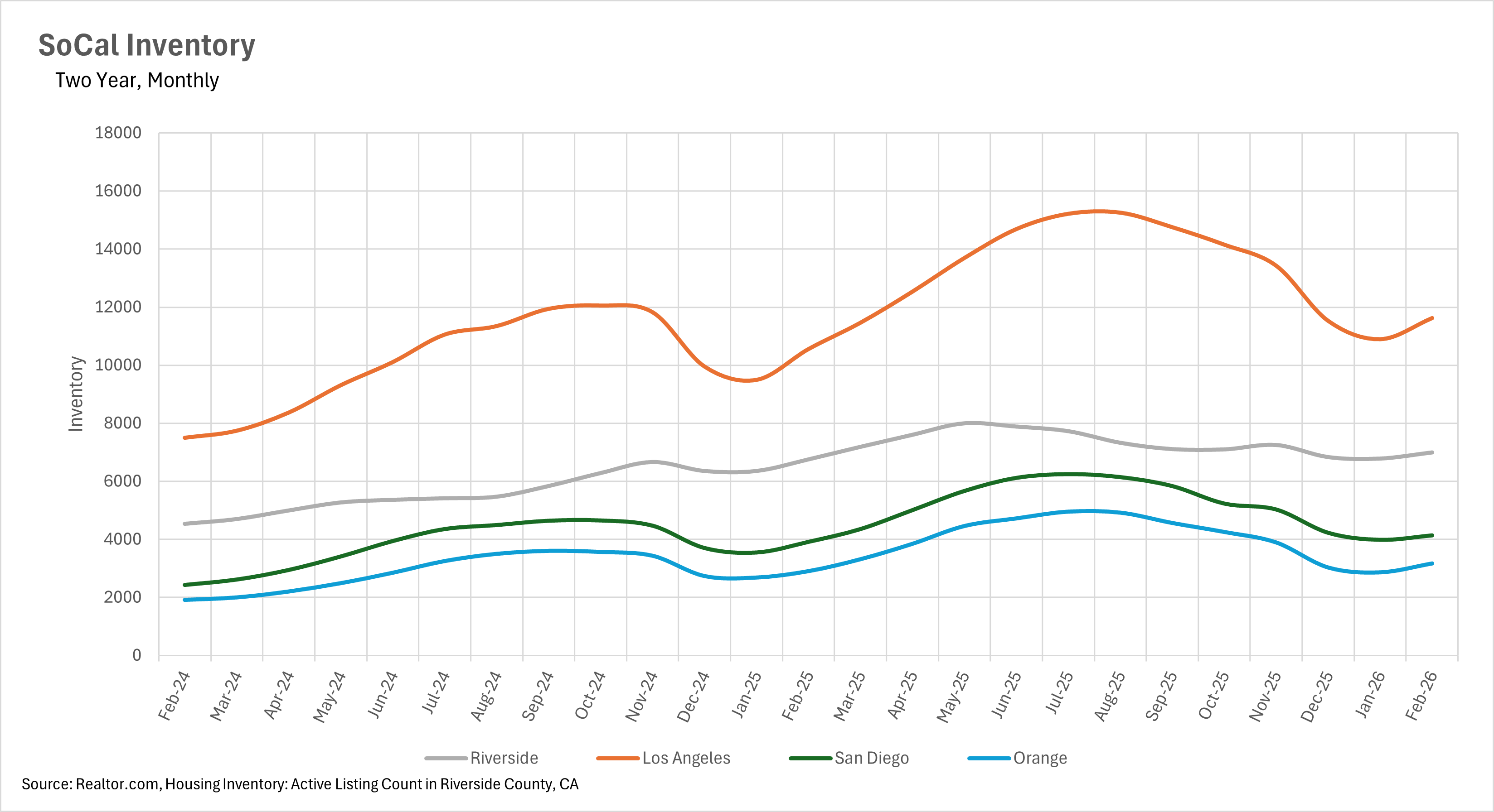 Inventory levels continue to climb throughout Southern California, giving buyers more options to choose from as we approach the spring selling season. Los Angeles leads the way with 11,624 active single-family home listings on the market as of February, representing a 10.13% increase on a year-over-year basis. Orange County follows with a 9.13% year-over-year increase, bringing active listings to 3,166. Riverside has seen inventory climb by 7.53% year-over-year to 6,991 homes, while San Diego has the smallest gap at just 5.70%, with 4,133 active listings. It's worth noting that San Diego's inventory picture has largely stabilized compared to the double-digit year-over-year increases we saw throughout the summer of 2025. Across the board, the month-over-month increases we're seeing are consistent with the typical seasonal pattern of new inventory entering the market as we approach the warmer months.
