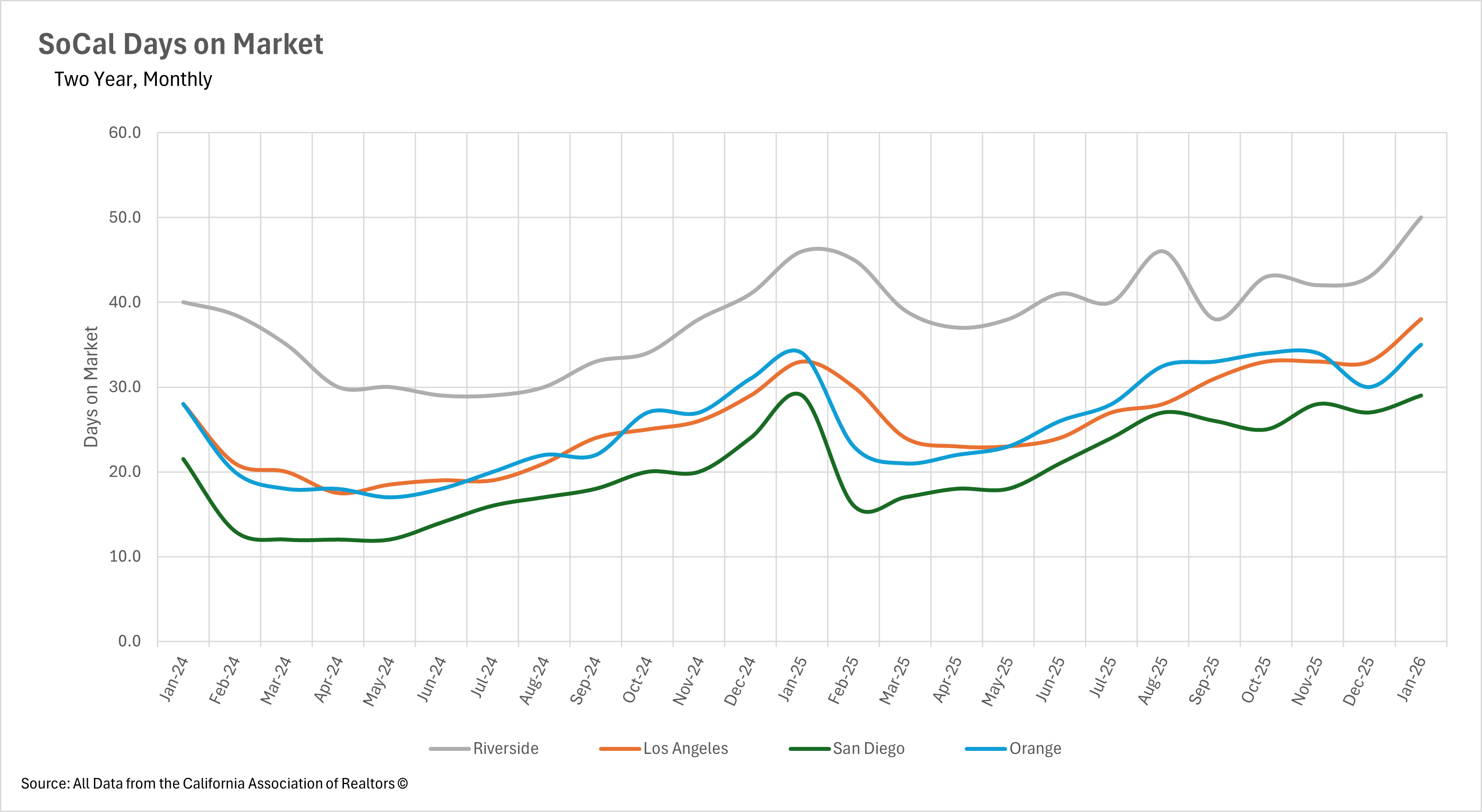 With inventory levels on the rise, it should come as no surprise that listings are spending more time on the market across Southern California. Riverside continues to see the longest selling times, with the median listing sitting for 50 days in January, representing a 10.53% increase on a year-over-year basis. Los Angeles is also seeing elevated market times at 38 days, up 15.15% from last year, which marks a meaningful jump from the 33 days we saw in each of the prior three months. Orange County saw listings spend 35 days on the market, a modest 2.94% year-over-year increase. The one bright spot is San Diego, where the median listing sat for 29 days, completely flat on a year-over-year basis. This stabilization in San Diego suggests that buyer activity is keeping pace with the flow of new inventory entering the market, while buyers in the other three markets are clearly taking more time to evaluate their options before pulling the trigger on offers.