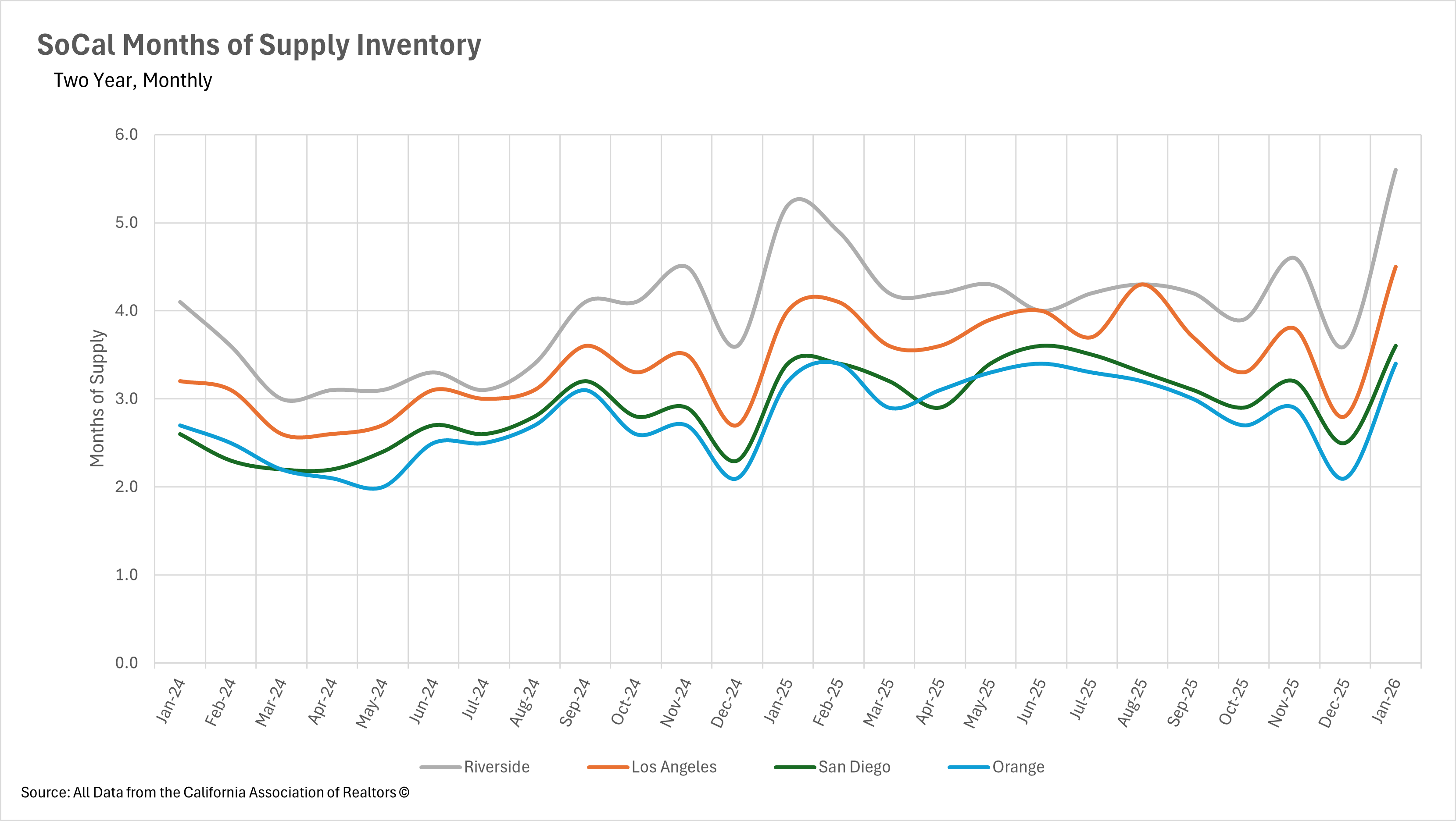 After briefly dipping into seller's market territory at the end of 2025, all four major Southern California markets have swung back into buyer's market territory to kick off the new year. Riverside leads the way with 5.6 months of supply, placing it firmly in buyer's market territory. Los Angeles follows with 4.5 months of supply, representing a 60.71% month-over-month increase and the highest level we've seen in more than a year. San Diego has 3.6 months of supply, up 44.00% from December, while Orange County sits at 3.4 months, a massive 61.90% month-over-month increase. This seasonal bounce is not uncommon, as buyer activity tends to slow during the winter months while new inventory enters the market. The big question heading into the spring is whether the uptick in demand that typically accompanies the warmer months will be enough to bring these figures back down, or if buyers will continue to hold the upper hand throughout the selling season.