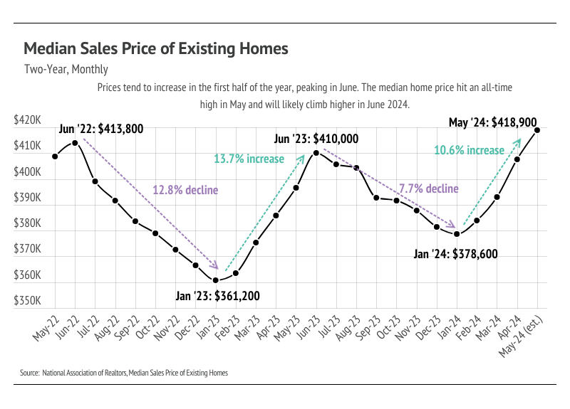 According to the National Association of Realtors® (NAR), the median sales price for existing homes grew 5.6% to $418,900 between May 2023 and the present — the eleventh consecutive month of year-over-year price growth, and the highest median price ever reached. Typically, the median price peaks in June each year, so we will likely see prices climb even higher when the data comes in for this month. In addition to NAR, the Case-Shiller 20-City Composite Home Price Index, which measures the aggregate price level of homes in the largest 20 metropolitan statistical areas, has reached a new high for the eighth month in a row. The combination of elevated mortgage rates and rising prices has brought affordability to an all-time low, which translates to fewer sales and growing inventory. However, at the same time, homes are spending less and less time on the market.