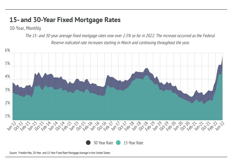 Median single-family home and condo prices declined month-over-month, landing slightly below their all-time highs. After two years of significant price growth, it’s hard not to think that rate increases have caused prices to bump into a ceiling. Without the aid of super low financing options, fewer potential buyers will participate in the market. So far in 2022, the average 30-year mortgage rate has increased over 2.5%, which equates to an approximately 33% increase in monthly mortgage payments. In other words, the new mortgage rate adds $730 per month on a $500,000 30-year fixed mortgage, for example (double that for a $1 million loan).Â